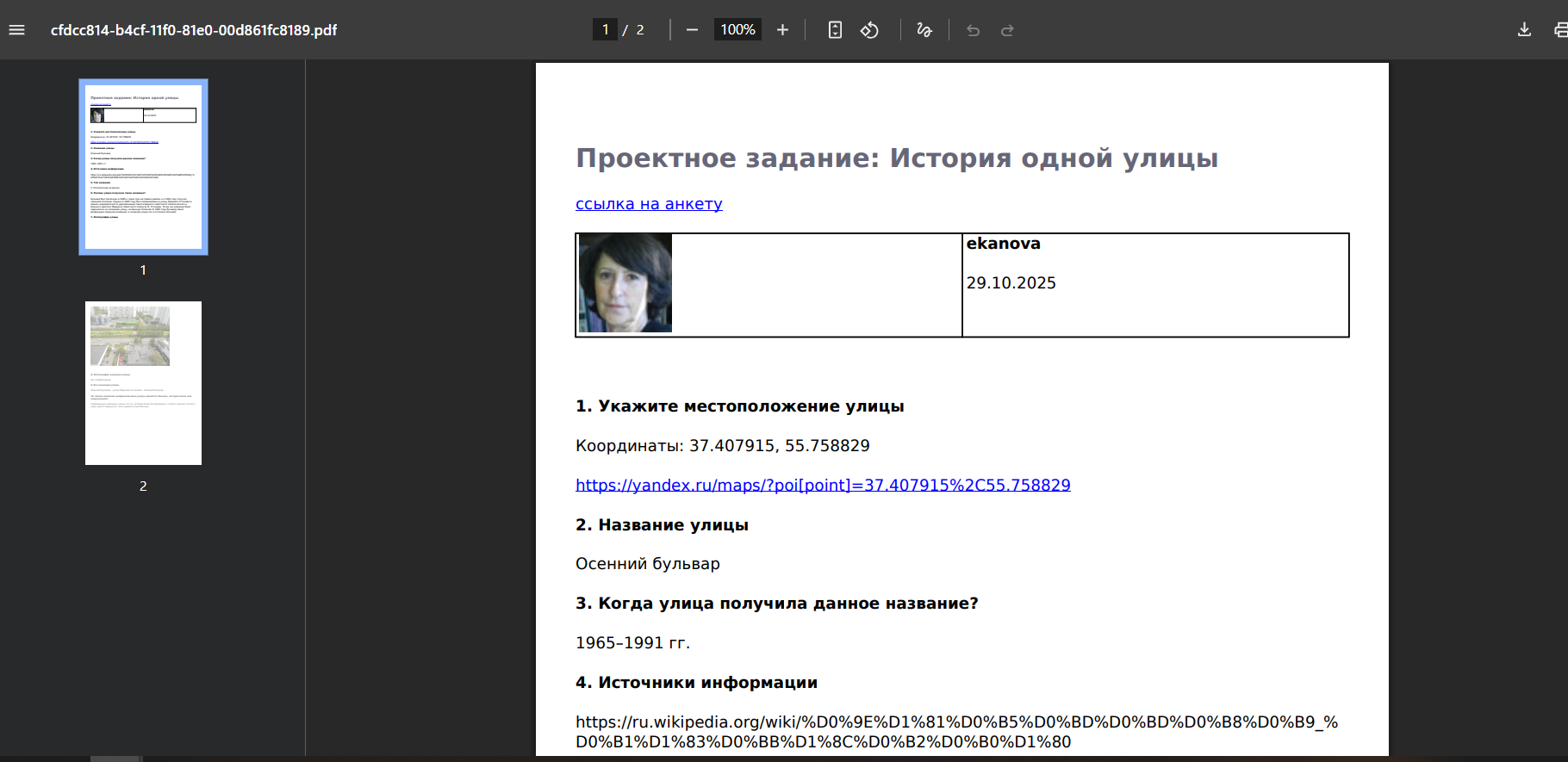 Дает возможность скачать анкету в виде документа для отчета, портфолио или проверки.