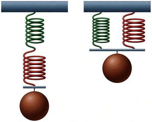 Если у вас нет одной длинной пружины, но есть 2 покороче, то можно выйти из положения, соединив их. Но соединить их можно по-разному: можно одну за другой (последовательно), а можно поместить их рядом и соединить (параллельно). Будут ли пружины, соединённые двумя этими способами, вести себя одинаково?